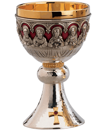 | Escena de la Ultima Cena alrededor de la copa con fondo en esmalte a fuego rojo. Cruz en la base.