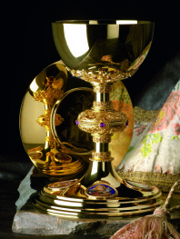 | Elegante diseño evocando a los grandes cálices alemanes de principios del siglo XX. Trabajo exquisito de filigrana en el fuste, nudo y copa exterior, adornado con piedras rubíes y zafiros reconstituidos estilo cabouson.