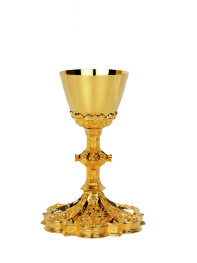 | Diseño gótico clásico de reducidas dimensiones. Con trabajos de altorrelieve repujado en la base y en la copa externa. El nudo se realiza prestando gran atención al riquísimo detalle.